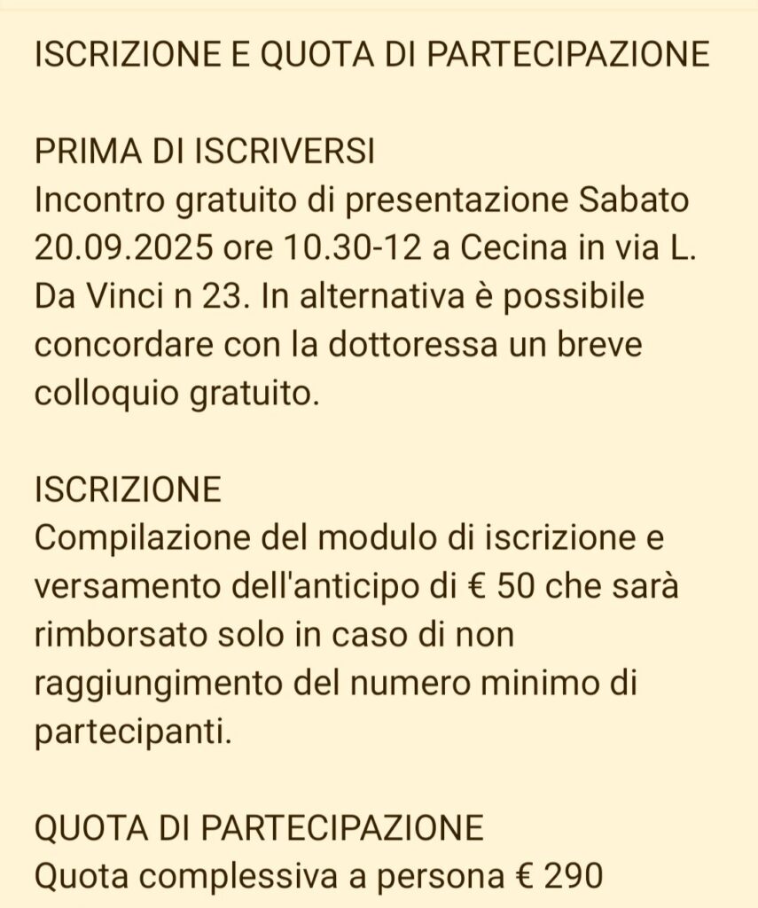 Sabato 28-06-2025 dalle 9 alle 11 e Mercoledì 02-07-2025 dalle 19 alle 21 nella pineta di Marina di Cecina. Costo di ogni singolo incontro: € 25 a persona. E’ necessario prenotarsi via telefono 339 3819332 oppure via email simonagian23@gmail.com